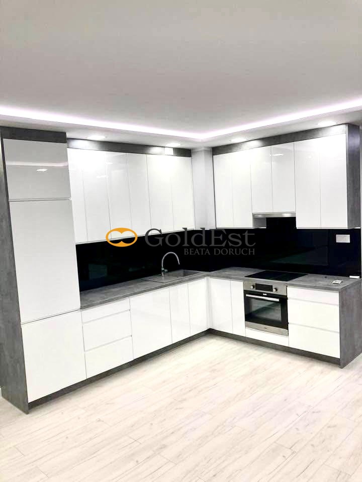 W kuchni zabudowa meblowa wraz z lodówko-zamrażalką, zmywarką, piekarnikiem. W łazience armatura; w przedpokoju szafa w zabudowie. Na podłogach panele i terakota. Nowe instalacje (elektryczna, wodna, kanalizacyjna).