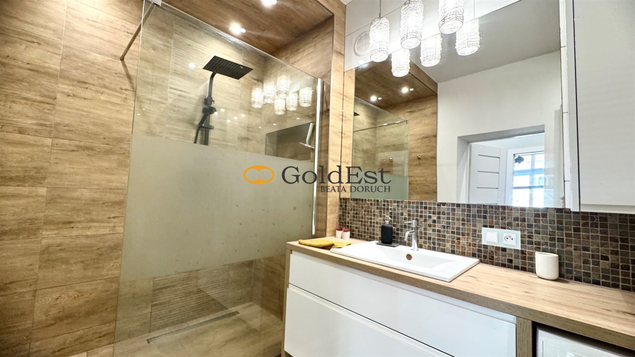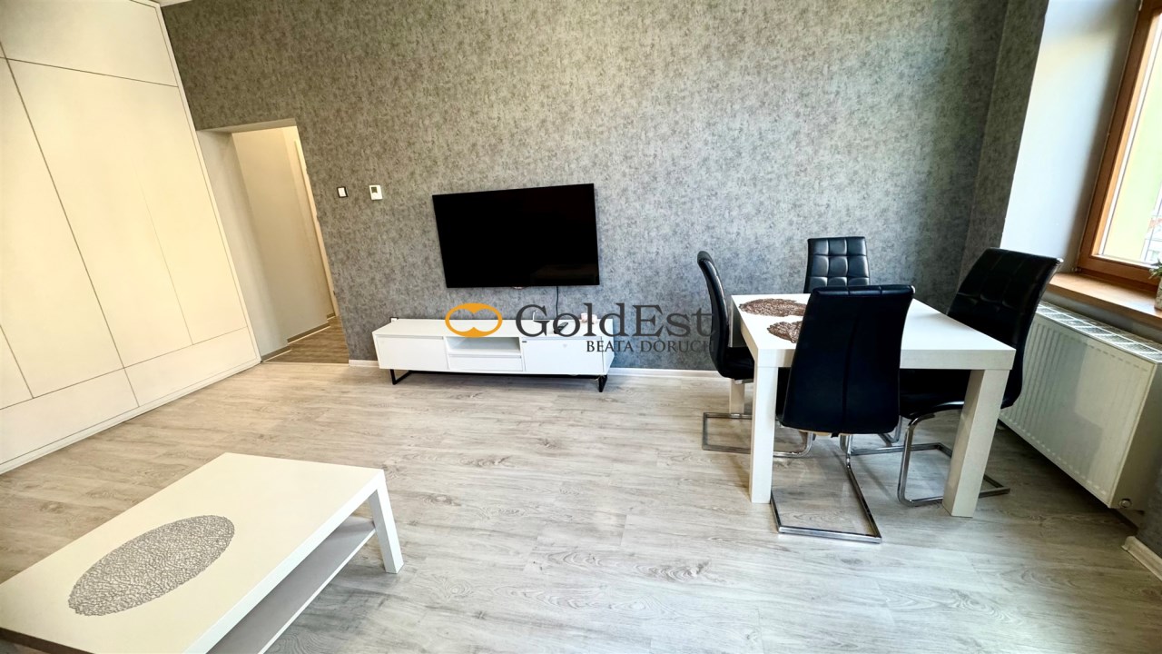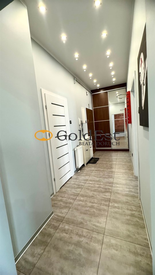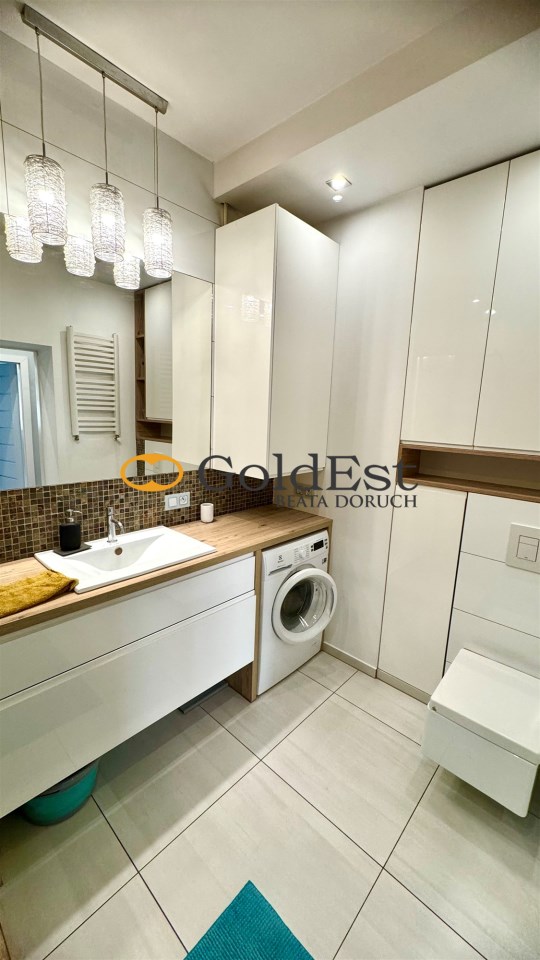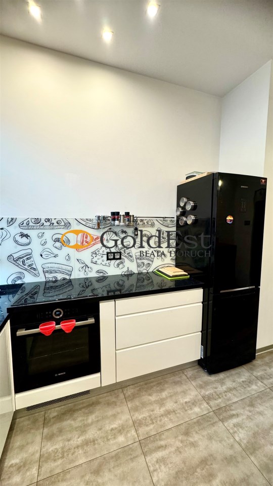 W salonie kanapa, stół z krzesłami, szafka rtv oraz zabudowana szafa na całą ścianę. W sypialni dwie szafki nocne oraz zabudowana szafa (możliwość dokupienia łóżka przez właściciela). W kuchni meble w zabudowie wraz ze sprzętem AGD (lodówko-zamrażalka, nowa płyta indukcyjna, piekarnik, zmywarka). Łazienka z dużą kabiną prysznicową, zabudowana umywalka oraz zabudowa nad sedesem, pralka (zakupiona w 2025 roku). Przedpokój jasny z dużą szafą przesuwną.